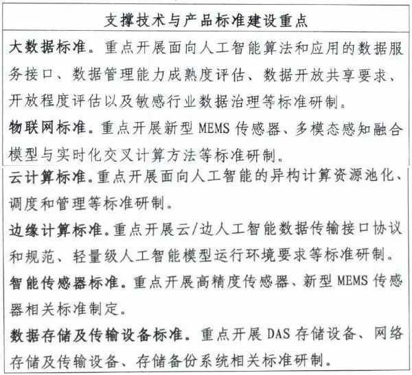 4.边缘计算标准。规范人工智能应用涉及的端计算设备、网络、数据与应用。包括数据传输接口协议、智能数据存储、端端协同、端云协同等标准。