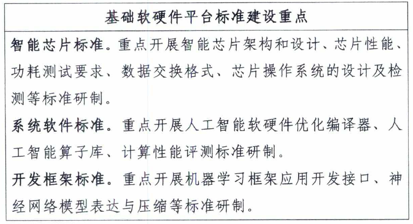 2.系统软件标准。规范人工智能软硬件优化编译器、人工智能算子库、人工智能软硬件平台计算性能等,促进软硬件平台的协同优化。