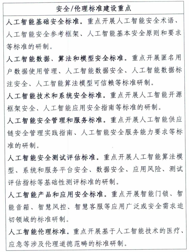 人工智能产品和应用安全标准主要是为保障人工智能技术、服务和产品在具体应用场景下的安全,可面向智能门锁、智能音响、智慧风控、智慧客服等应用成熟、使用广泛或安全需求迫切的领域进行标准研制。